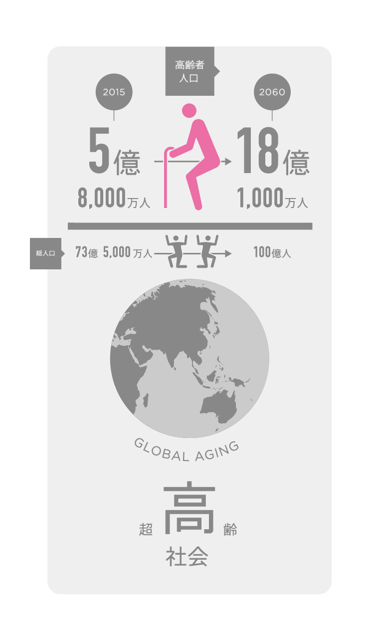 日本のみならず、世界でも人口構造の変化や高齢化率の上昇という問題は起こっています。2015年、世界の総人口は約73億5千万人ですが、2060年には100億人を突破。総人口に占める65歳以上の割合、すなわち高齢化率も上昇すると見られていて、2015年の5億8000万人から、2060年には18億1000万人になるだろうとされています。こうした「グローバルエイジング」という現象が世界の各地で始まるなか、他国に先駆け、いち早く超高齢社会に突入した日本が、世界のモデルケースとして機能できるか。ここに、世界は注目しています。確かに、「福祉が破綻する」「高齢化が進む」という悲観の声も聞かれます。しかし、未来を悲観しても幸せな社会は築けません。それならば、いまこそ医療や福祉の分野でイノベーションを起こし、より幸せで豊かな世界に変えていく。