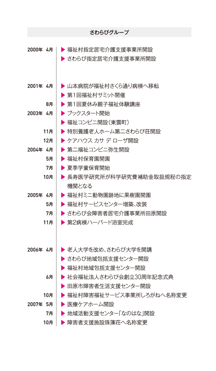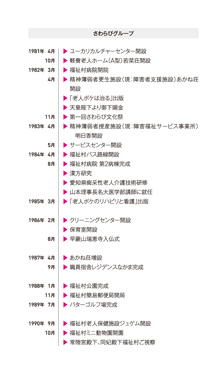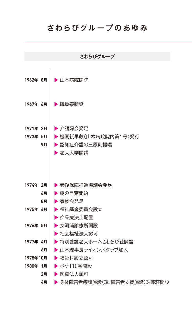 創設者である山本孝之が脳卒中のリハビリ病院として山本病院を開業したのが1962年。以来、認知症のケアにとどまらず、リハビリ病院と授産所を中心に、高齢者、身体障がい者、知的障がい者のための施設を同じ敷地の中につくり、みなさんが自立を目指してリハビリや訓練を受けるとともに、お互いに助け合って暮らしてきたのが福祉村を中心とするさわらび会です。