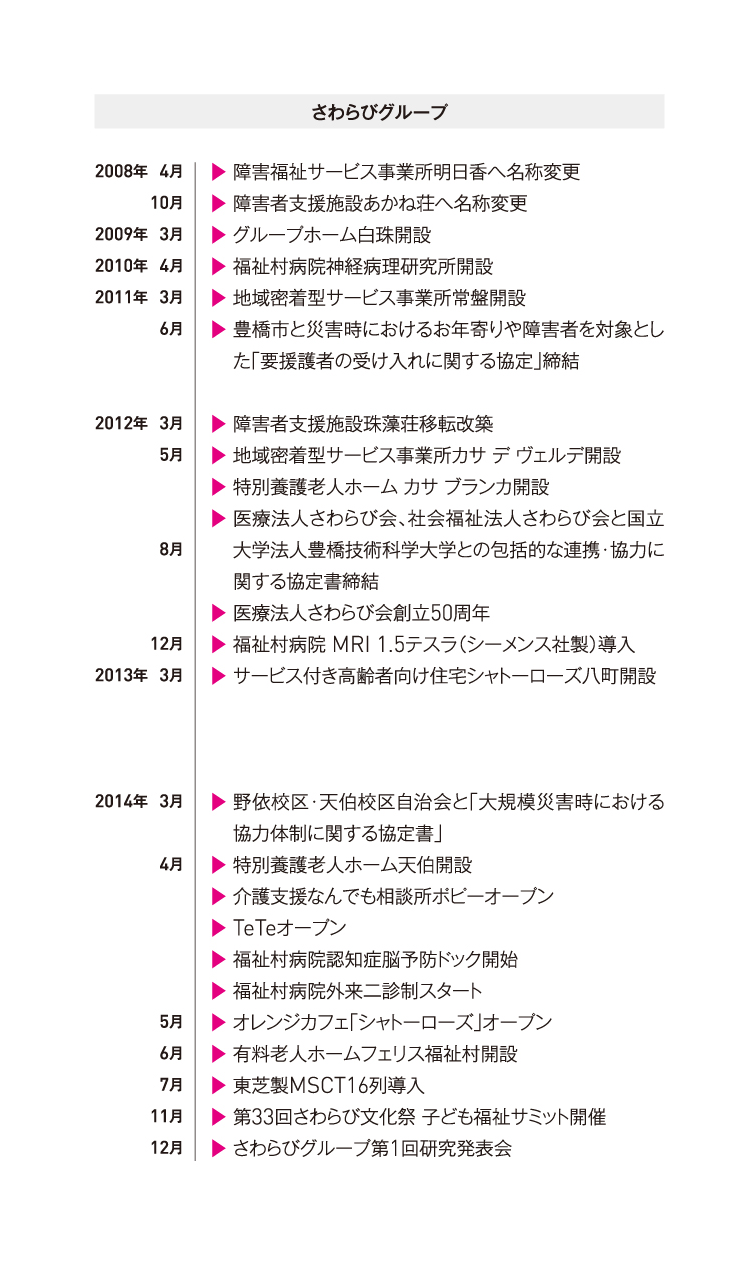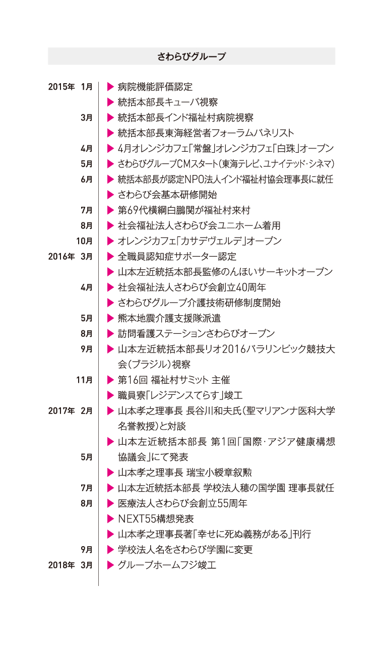 「みんなの力で、みんなの幸せを」という理念に込められた、幸せとは自立して自由に生き、まわりの人に役立つ働きができる時に感じるものという想い。私たちの役割は、山本孝之のその想いを絶やすことなく、さらに発展させることだと思っています。認知症をはじめとして医療や介護のさらなる研究を進めることはもちろん、さわらび会の存在や理念を日本だけでなく世界中の人々にも広げ、すべての人がいつも笑顔で幸せに生きていける社会をつくるために、これからも全力をつくしていきます。