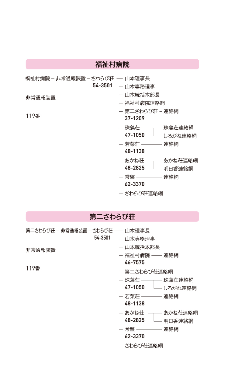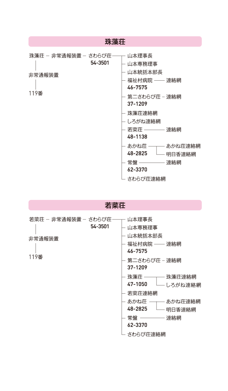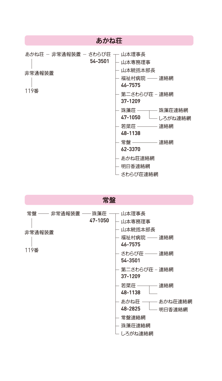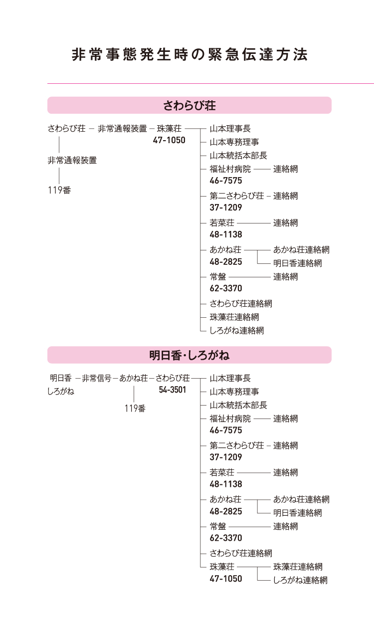 ◦各施設の代表電話番号は、ご利用者ご家族者様向け伝言を残す。
