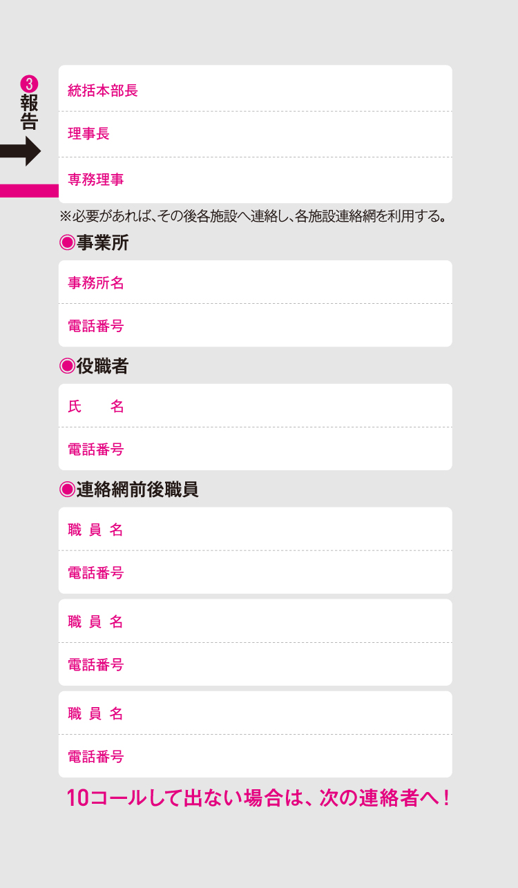 ◦スタッフは、安否、怪我の有無、施設への出勤の可否、今後の見通しを伝言に残す。